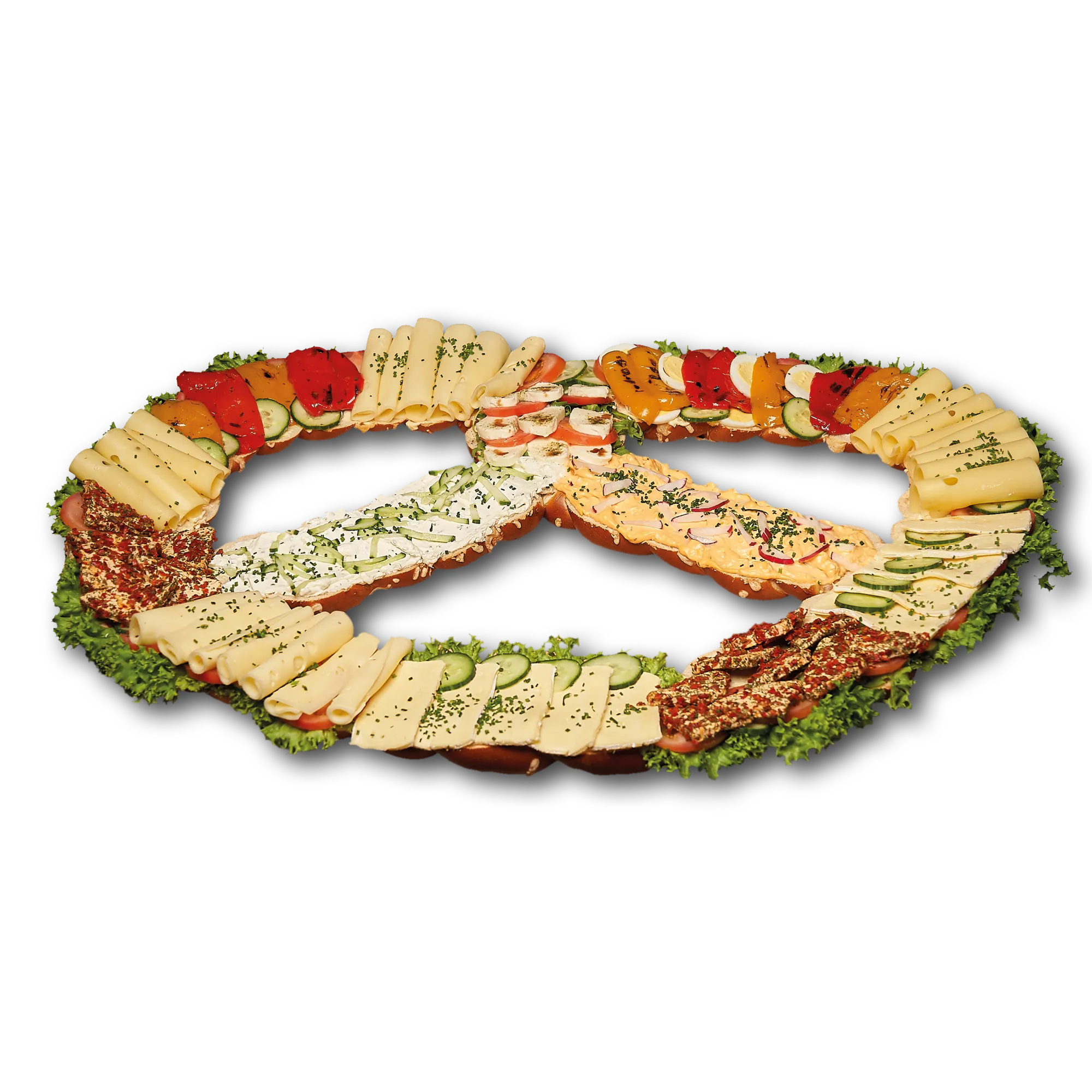 belegt mit Tomate/Mozzarella, FrischkĂ€se, Obatzter, Camembert, pikante KĂ€seecken, GrillgemĂŒse. Garniert mit Salat, Gurken, Tomaten, Radieschen, Ei und Schnittlauch