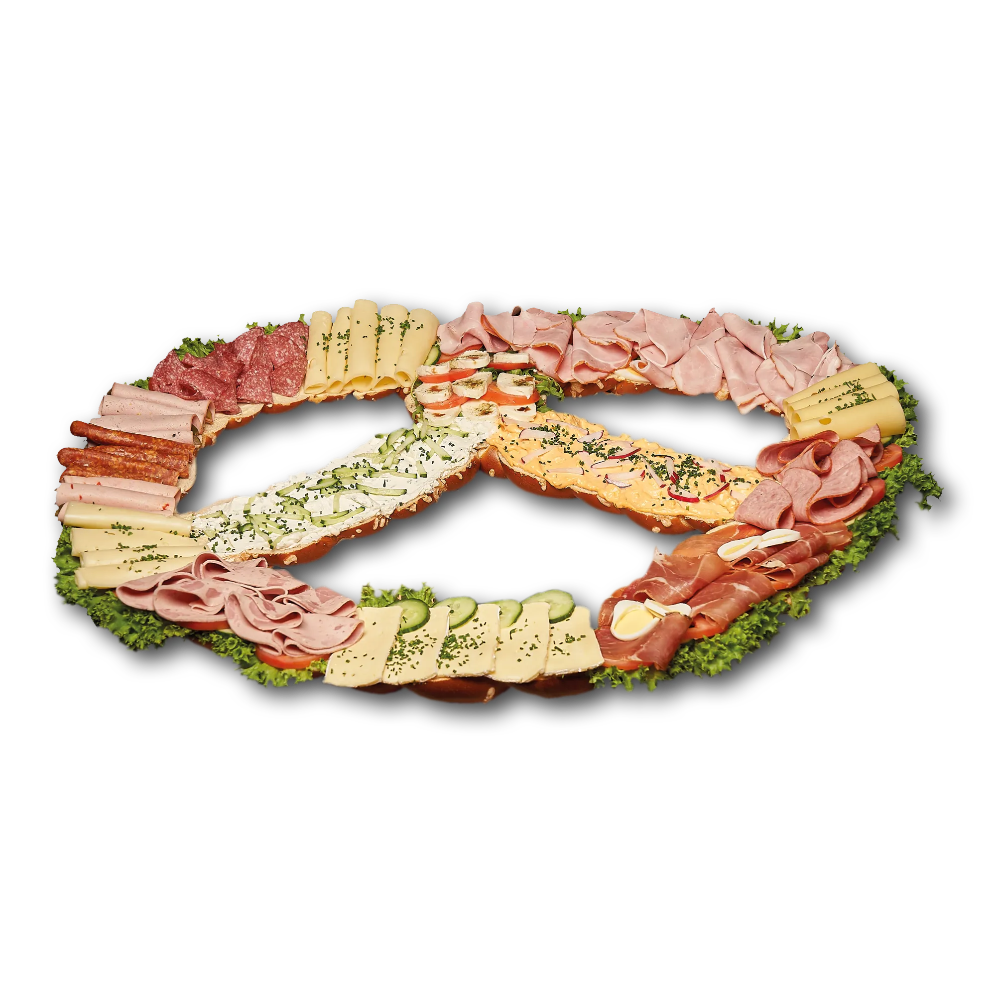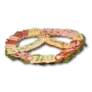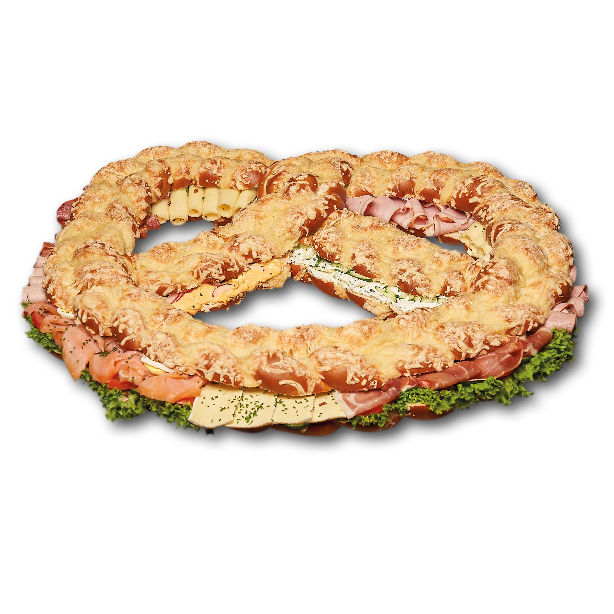 WEIZENMEHL, Wasser, Tomaten, BUTTER, Schinken gekocht (mit Phosphat, Antioxidationsmittel, Geschmacksverstärker, Nitritpökelsalz), Salami (mit Antioxidationsmittel / mit Farbstoff: echtes Karmin, Nitritpökelsalz), Wurstbelag gemischt (mit Antioxidationsmittel, Geschmacksverstärker, Nitritpökelsalz), GRÜNLÄNDER KÄSE (MIT FARBSTOFF: BETACAROTIN), Salat, EIER, Gurke, Schmalz, Hefe, ROGGENMEHL, Schinken geräuchert, GERSTENMALZ, Salz, KRÄUTERFRISCHKÄSE, Brezensalz, ESSIGGURKEN, GERSTENMALZ, OBATZTER: MIT KONSERVIERUNGSMITTEL, GERSTENMALZ, SOJAMEHL, Schnittlauch, Brezenlauge, Hefe